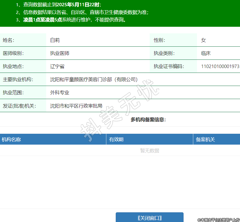 姓名:白莉性別:女醫(yī)師級別:執(zhí)業(yè)醫(yī)師執(zhí)業(yè)類別:臨床執(zhí)業(yè)地點:遼寧省執(zhí)業(yè)證書編碼:110210100001973主要執(zhí)業(yè)機構:沈陽和平童顏醫(yī)療美容門診部(有限公司)執(zhí)業(yè)范圍:外科專業(yè)發(fā)證(批準)機關:沈陽市和平區(qū)行政審批局 -