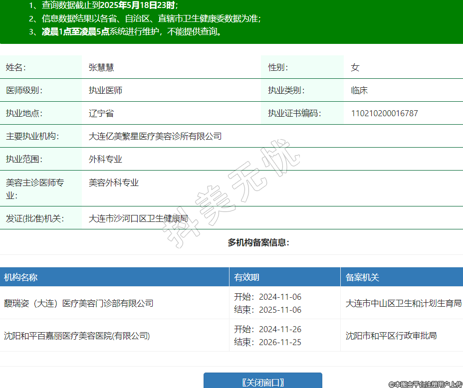 姓名:張慧慧性別:女醫(yī)師級別:執(zhí)業(yè)醫(yī)師執(zhí)業(yè)類別:臨床執(zhí)業(yè)地點:遼寧省執(zhí)業(yè)證書編碼:110210200016787主要執(zhí)業(yè)機構:大連億美繁星醫(yī)療美容診所有限公司執(zhí)業(yè)范圍:外科專業(yè)美容主診醫(yī)師專業(yè):美容外科專業(yè)發(fā)證(批準)機關:大連市沙河口區(qū)衛(wèi)生健康局多機構備案信息:機構名稱 有效期 備案機關 馥瑞姿(大連)醫(yī)療美容門診部有限公司 開始:2024-11-06結束:2025-11-06大連市中山區(qū)衛(wèi)生和計劃生育局 沈陽和平百嘉麗醫(yī)療美容醫(yī)院(有限公司) 開始:2024-11-26結束:2026-11-25沈陽市和平區(qū)行政審批局 -