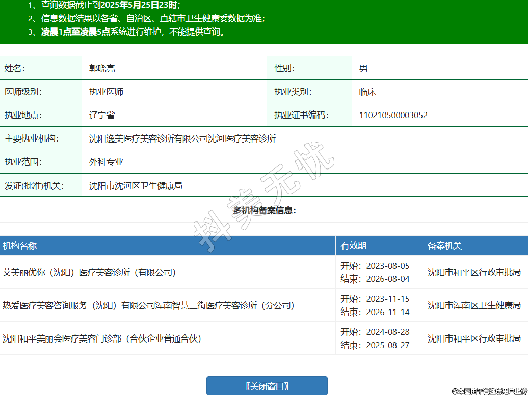 姓名:郭曉亮性別:男醫(yī)師級別:執(zhí)業(yè)醫(yī)師執(zhí)業(yè)類別:臨床執(zhí)業(yè)地點(diǎn):遼寧省執(zhí)業(yè)證書編碼:110210500003052主要執(zhí)業(yè)機(jī)構(gòu):沈陽逸美醫(yī)療美容診所有限公司沈河醫(yī)療美容診所執(zhí)業(yè)范圍:外科專業(yè)發(fā)證(批準(zhǔn))機(jī)關(guān):沈陽市沈河區(qū)衛(wèi)生健康局多機(jī)構(gòu)備案信息:機(jī)構(gòu)名稱 有效期 備案機(jī)關(guān) 艾美麗優(yōu)你(沈陽)醫(yī)療美容診所(有限公司) 開始:2023-08-05結(jié)束:2026-08-04沈陽市和平區(qū)行政審批局 熱愛醫(yī)療美容咨詢服務(wù)(沈陽)有限公司渾南智慧三街醫(yī)療美容診所(分公司) 開始:2023-11-15結(jié)束:2026-11-14沈陽市渾南區(qū)衛(wèi)生健康局 沈陽和平美麗會醫(yī)療美容門診部(合伙企業(yè)普通合伙) 開始:2024-08-28結(jié)束:2025-08-27沈陽市和平區(qū)行政審批局 -