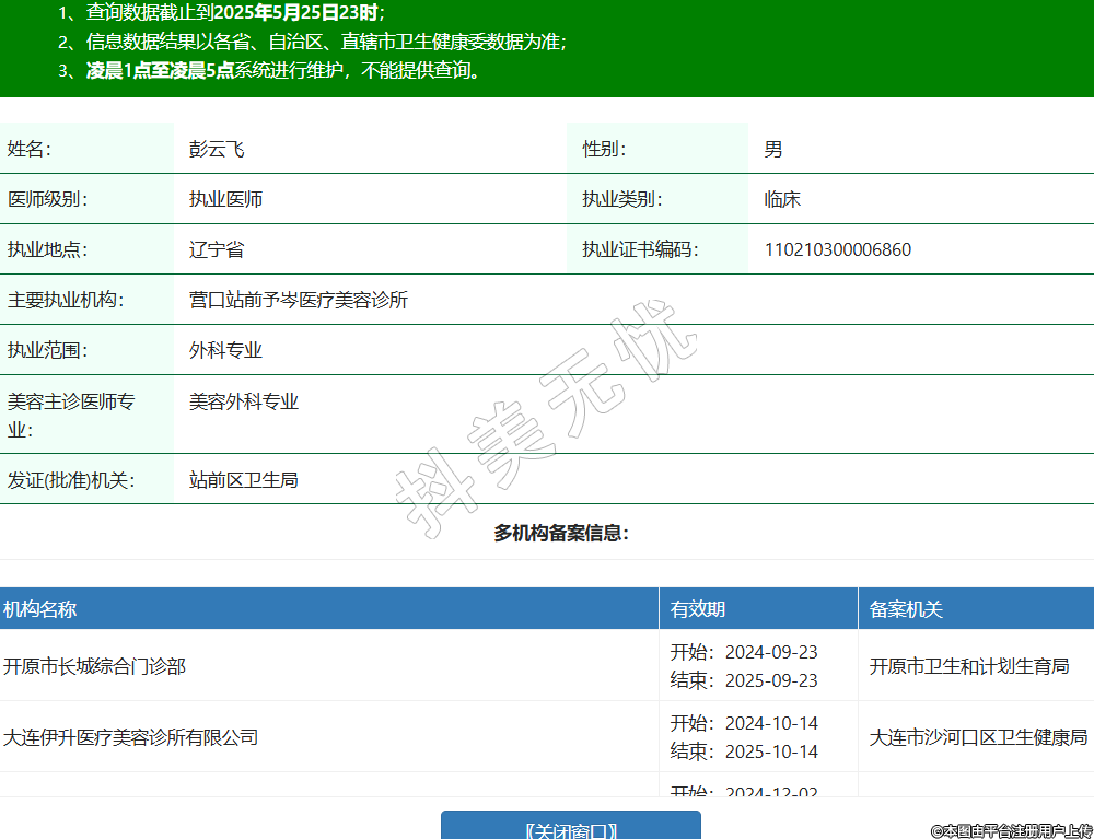 姓名:彭云飛性別:男醫(yī)師級別:執(zhí)業(yè)醫(yī)師執(zhí)業(yè)類別:臨床執(zhí)業(yè)地點:遼寧省執(zhí)業(yè)證書編碼:110210300006860主要執(zhí)業(yè)機構:營口站前予岑醫(yī)療美容診所執(zhí)業(yè)范圍:外科專業(yè)美容主診醫(yī)師專業(yè):美容外科專業(yè)發(fā)證(批準)機關:站前區(qū)衛(wèi)生局多機構備案信息:機構名稱 有效期 備案機關 開原市長城綜合門診部 開始:2024-09-23結(jié)束:2025-09-23開原市衛(wèi)生和計劃生育局 大連伊升醫(yī)療美容診所有限公司 開始:2024-10-14結(jié)束:2025-10-14大連市沙河口區(qū)衛(wèi)生健康局 大連銳斯醫(yī)療美容診所有限公司 開始:2024-12-02結(jié)束:2025-12-01大連市沙河口區(qū)衛(wèi)生健康局 大連初禾醫(yī)美綜合門診部有限公司 開始:2025-03-24結(jié)束:2028-03-31莊河市衛(wèi)生健康局 沈陽澳紫汣美醫(yī)療管理有限公司渾南臨波路醫(yī)療美容診所(分公司) 開始:2025-04-21結(jié)束:2028-04-29沈陽市渾南區(qū)衛(wèi)生健康局 -