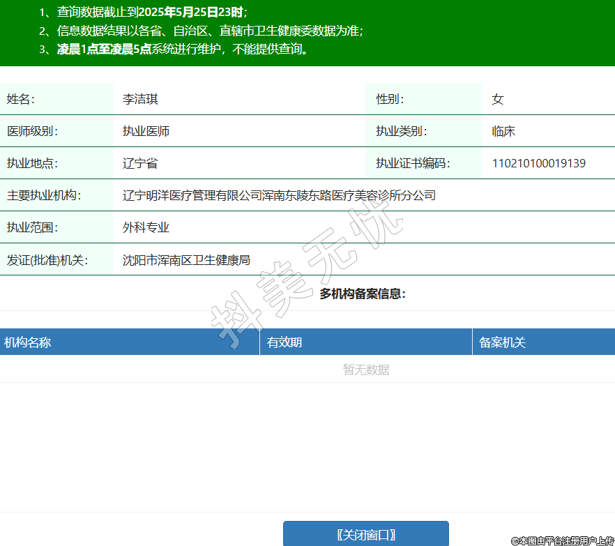 姓名:李潔琪性別:女醫(yī)師級別:執(zhí)業(yè)醫(yī)師執(zhí)業(yè)類別:臨床執(zhí)業(yè)地點:遼寧省執(zhí)業(yè)證書編碼:110210100019139主要執(zhí)業(yè)機構(gòu):遼寧明洋醫(yī)療管理有限公司渾南東陵東路醫(yī)療美容診所分公司執(zhí)業(yè)范圍:外科專業(yè)發(fā)證(批準)機關(guān):沈陽市渾南區(qū)衛(wèi)生健康局 -