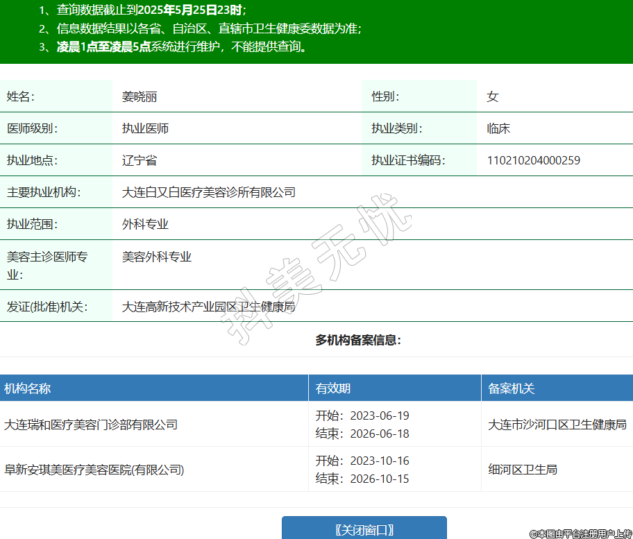 姓名:姜曉麗性別:女醫(yī)師級(jí)別:執(zhí)業(yè)醫(yī)師執(zhí)業(yè)類別:臨床執(zhí)業(yè)地點(diǎn):遼寧省執(zhí)業(yè)證書編碼:110210204000259主要執(zhí)業(yè)機(jī)構(gòu):大連白又白醫(yī)療美容診所有限公司執(zhí)業(yè)范圍:外科專業(yè)美容主診醫(yī)師專業(yè):美容外科專業(yè)發(fā)證(批準(zhǔn))機(jī)關(guān):大連高新技術(shù)產(chǎn)業(yè)園區(qū)衛(wèi)生健康局多機(jī)構(gòu)備案信息:機(jī)構(gòu)名稱 有效期 備案機(jī)關(guān) 大連瑞和醫(yī)療美容門診部有限公司 開始:2023-06-19結(jié)束:2026-06-18大連市沙河口區(qū)衛(wèi)生健康局 阜新安琪美醫(yī)療美容醫(yī)院(有限公司) 開始:2023-10-16結(jié)束:2026-10-15細(xì)河區(qū)衛(wèi)生局 -