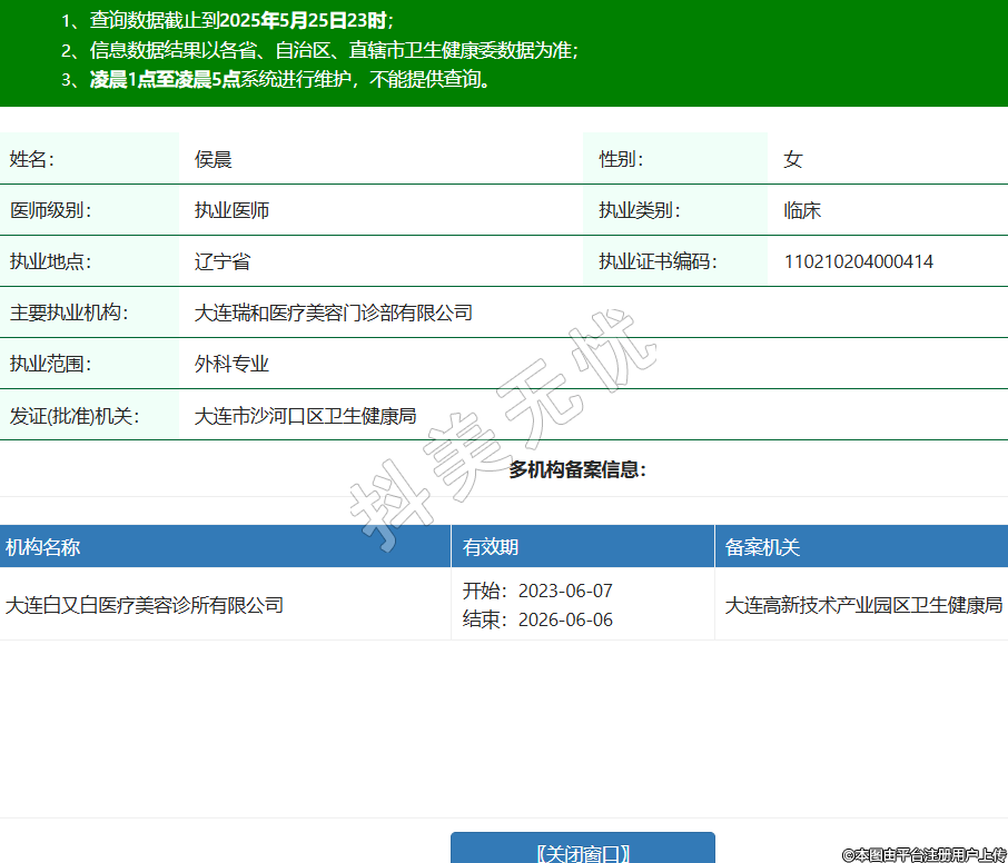 姓名:侯晨性別:女醫(yī)師級別:執(zhí)業(yè)醫(yī)師執(zhí)業(yè)類別:臨床執(zhí)業(yè)地點(diǎn):遼寧省執(zhí)業(yè)證書編碼:110210204000414主要執(zhí)業(yè)機(jī)構(gòu):大連瑞和醫(yī)療美容門診部有限公司執(zhí)業(yè)范圍:外科專業(yè)發(fā)證(批準(zhǔn))機(jī)關(guān):大連市沙河口區(qū)衛(wèi)生健康局多機(jī)構(gòu)備案信息:機(jī)構(gòu)名稱 有效期 備案機(jī)關(guān) 大連白又白醫(yī)療美容診所有限公司 開始:2023-06-07結(jié)束:2026-06-06大連高新技術(shù)產(chǎn)業(yè)園區(qū)衛(wèi)生健康局 -