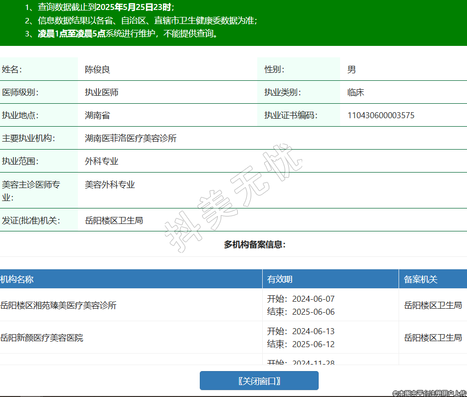 姓名:陳俊良性別:男醫(yī)師級(jí)別:執(zhí)業(yè)醫(yī)師執(zhí)業(yè)類(lèi)別:臨床執(zhí)業(yè)地點(diǎn):湖南省執(zhí)業(yè)證書(shū)編碼:110430600003575主要執(zhí)業(yè)機(jī)構(gòu):湖南醫(yī)菲洛醫(yī)療美容診所執(zhí)業(yè)范圍:外科專(zhuān)業(yè)美容主診醫(yī)師專(zhuān)業(yè):美容外科專(zhuān)業(yè)發(fā)證(批準(zhǔn))機(jī)關(guān):岳陽(yáng)樓區(qū)衛(wèi)生局多機(jī)構(gòu)備案信息:機(jī)構(gòu)名稱(chēng) 有效期 備案機(jī)關(guān) 岳陽(yáng)樓區(qū)湘苑臻美醫(yī)療美容診所 開(kāi)始:2024-06-07結(jié)束:2025-06-06岳陽(yáng)樓區(qū)衛(wèi)生局 岳陽(yáng)新顏醫(yī)療美容醫(yī)院 開(kāi)始:2024-06-13結(jié)束:2025-06-12岳陽(yáng)樓區(qū)衛(wèi)生局 昱恩醫(yī)療美容診所 開(kāi)始:2024-11-28結(jié)束:2025-11-27岳陽(yáng)樓區(qū)衛(wèi)生局 岳陽(yáng)市岳陽(yáng)樓區(qū)艾妃爾醫(yī)療美容門(mén)診部 開(kāi)始:2024-12-30結(jié)束:2025-12-29岳陽(yáng)樓區(qū)衛(wèi)生局 岳陽(yáng)芯美醫(yī)療美容診所 開(kāi)始:2025-03-29結(jié)束:2026-03-28岳陽(yáng)樓區(qū)衛(wèi)生局 -