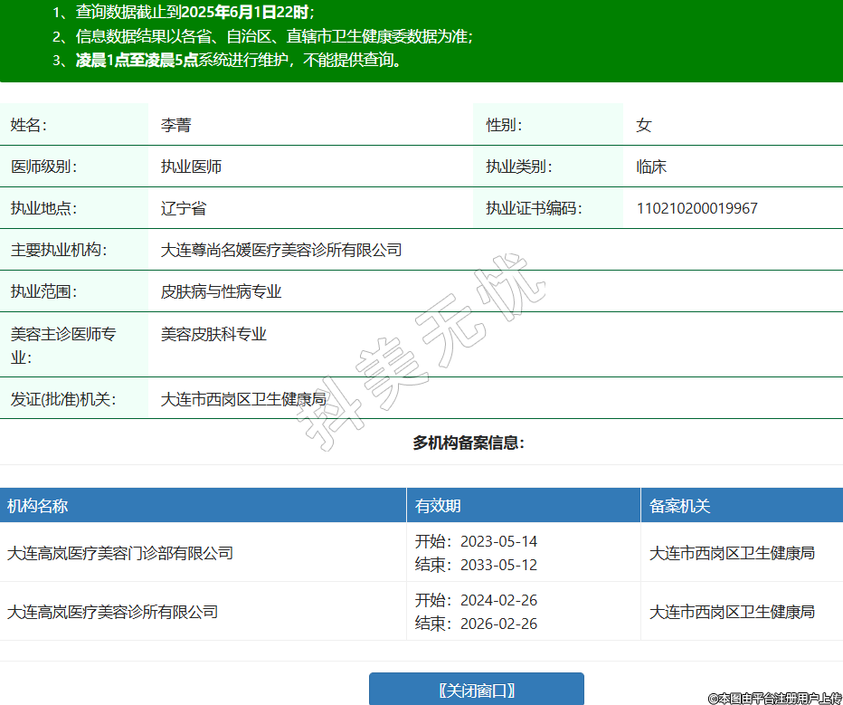 姓名:李菁性別:女醫(yī)師級別:執(zhí)業(yè)醫(yī)師執(zhí)業(yè)類別:臨床執(zhí)業(yè)地點:遼寧省執(zhí)業(yè)證書編碼:110210200019967主要執(zhí)業(yè)機(jī)構(gòu):大連尊尚名媛醫(yī)療美容診所有限公司執(zhí)業(yè)范圍:皮膚病與性病專業(yè)美容主診醫(yī)師專業(yè):美容皮膚科專業(yè)發(fā)證(批準(zhǔn))機(jī)關(guān):大連市西崗區(qū)衛(wèi)生健康局多機(jī)構(gòu)備案信息:機(jī)構(gòu)名稱 有效期 備案機(jī)關(guān) 大連高嵐醫(yī)療美容門診部有限公司 開始:2023-05-14結(jié)束:2033-05-12大連市西崗區(qū)衛(wèi)生健康局 大連高嵐醫(yī)療美容診所有限公司 開始:2024-02-26結(jié)束:2026-02-26大連市西崗區(qū)衛(wèi)生健康局 -