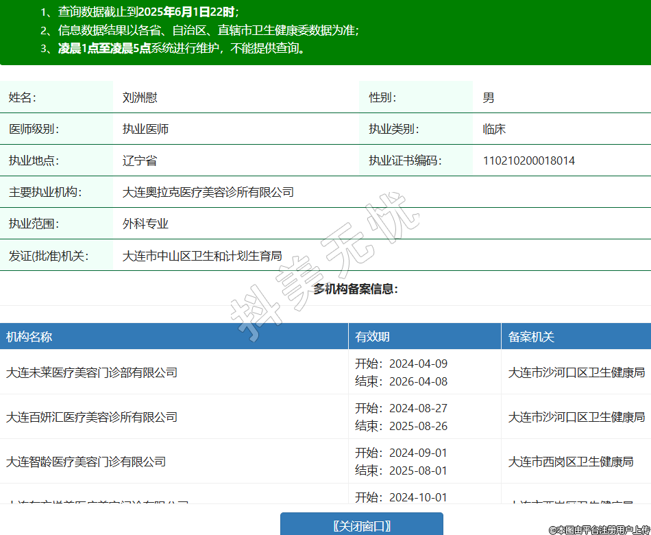姓名:劉洲慰性別:男醫(yī)師級別:執(zhí)業(yè)醫(yī)師執(zhí)業(yè)類別:臨床執(zhí)業(yè)地點:遼寧省執(zhí)業(yè)證書編碼:110210200018014主要執(zhí)業(yè)機構(gòu):大連奧拉克醫(yī)療美容診所有限公司執(zhí)業(yè)范圍:外科專業(yè)發(fā)證(批準)機關(guān):大連市中山區(qū)衛(wèi)生和計劃生育局多機構(gòu)備案信息:機構(gòu)名稱 有效期 備案機關(guān) 大連未萊醫(yī)療美容門診部有限公司 開始:2024-04-09結(jié)束:2026-04-08大連市沙河口區(qū)衛(wèi)生健康局 大連百妍匯醫(yī)療美容診所有限公司 開始:2024-08-27結(jié)束:2025-08-26大連市沙河口區(qū)衛(wèi)生健康局 大連智齡醫(yī)療美容門診有限公司 開始:2024-09-01結(jié)束:2025-08-01大連市西崗區(qū)衛(wèi)生健康局 大連東方悅美醫(yī)療美容門診有限公司 開始:2024-10-01結(jié)束:2025-09-01大連市西崗區(qū)衛(wèi)生健康局 大連華美希華醫(yī)療美容門診部有限公司 開始:2024-12-26結(jié)束:2025-12-25大連市沙河口區(qū)衛(wèi)生健康局 大連金普新區(qū)星萊美匯醫(yī)療美容診所有限公司 開始:2025-04-28結(jié)束:2026-04-27大連金普新區(qū)衛(wèi)生健康局 -