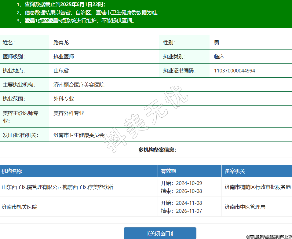 姓名:路秦龍性別:男醫(yī)師級(jí)別:執(zhí)業(yè)醫(yī)師執(zhí)業(yè)類別:臨床執(zhí)業(yè)地點(diǎn):山東省執(zhí)業(yè)證書(shū)編碼:110370000044994主要執(zhí)業(yè)機(jī)構(gòu):濟(jì)南麗合醫(yī)療美容醫(yī)院執(zhí)業(yè)范圍:外科專業(yè)美容主診醫(yī)師專業(yè):美容外科專業(yè)發(fā)證(批準(zhǔn))機(jī)關(guān):濟(jì)南市衛(wèi)生健康委員會(huì)多機(jī)構(gòu)備案信息:機(jī)構(gòu)名稱 有效期 備案機(jī)關(guān) 山東西子醫(yī)院管理有限公司槐蔭西子醫(yī)療美容診所 開(kāi)始:2024-10-09結(jié)束:2026-10-08濟(jì)南市槐蔭區(qū)行政審批服務(wù)局 濟(jì)南市機(jī)關(guān)醫(yī)院 開(kāi)始:2024-11-08結(jié)束:2026-11-07濟(jì)南市中醫(yī)管理局 -