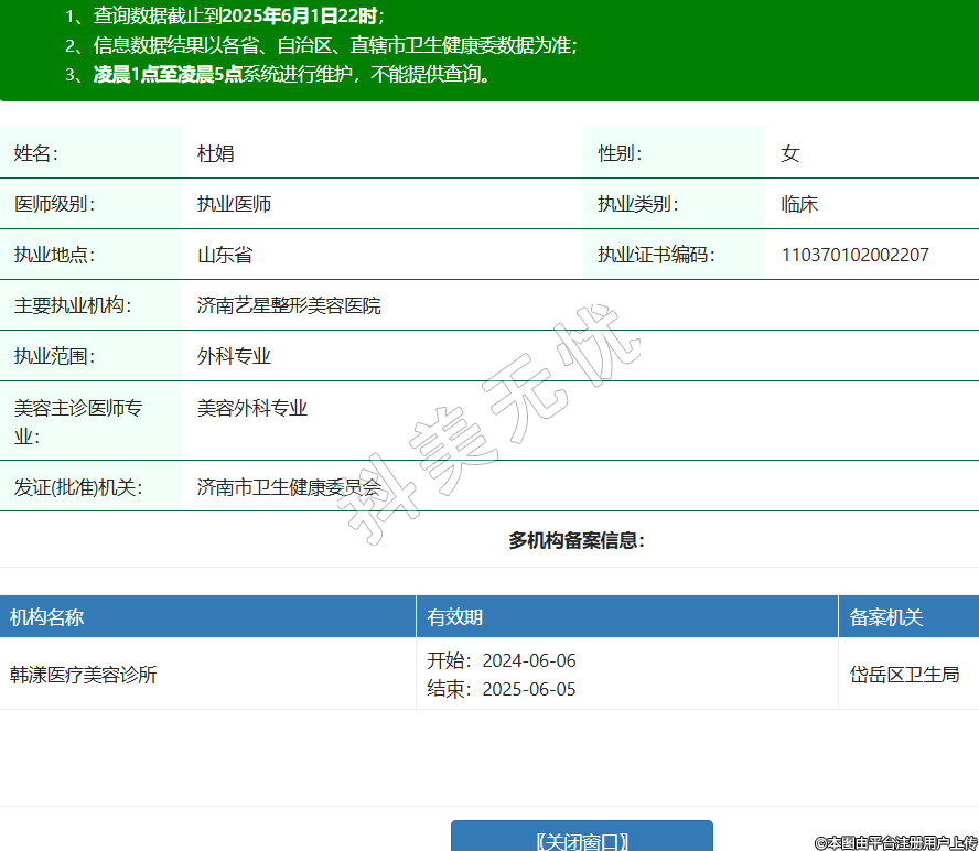 姓名:杜娟性別:女醫(yī)師級(jí)別:執(zhí)業(yè)醫(yī)師執(zhí)業(yè)類(lèi)別:臨床執(zhí)業(yè)地點(diǎn):山東省執(zhí)業(yè)證書(shū)編碼:110370102002207主要執(zhí)業(yè)機(jī)構(gòu):濟(jì)南藝星整形美容醫(yī)院執(zhí)業(yè)范圍:外科專(zhuān)業(yè)美容主診醫(yī)師專(zhuān)業(yè):美容外科專(zhuān)業(yè)發(fā)證(批準(zhǔn))機(jī)關(guān):濟(jì)南市衛(wèi)生健康委員會(huì)多機(jī)構(gòu)備案信息:機(jī)構(gòu)名稱(chēng) 有效期 備案機(jī)關(guān) 韓漾醫(yī)療美容診所 開(kāi)始:2024-06-06結(jié)束:2025-06-05岱岳區(qū)衛(wèi)生局 -