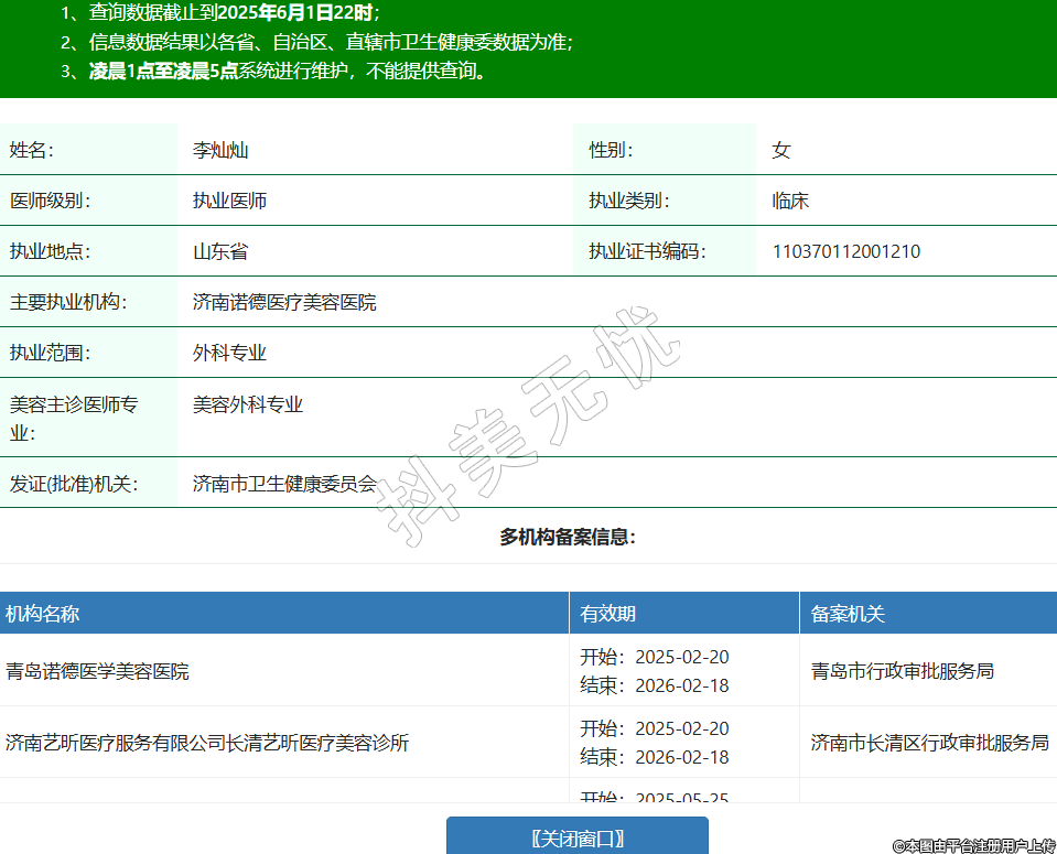 姓名:李燦燦性別:女醫(yī)師級別:執(zhí)業(yè)醫(yī)師執(zhí)業(yè)類別:臨床執(zhí)業(yè)地點:山東省執(zhí)業(yè)證書編碼:110370112001210主要執(zhí)業(yè)機構(gòu):濟南諾德醫(yī)療美容醫(yī)院執(zhí)業(yè)范圍:外科專業(yè)美容主診醫(yī)師專業(yè):美容外科專業(yè)發(fā)證(批準(zhǔn))機關(guān):濟南市衛(wèi)生健康委員會多機構(gòu)備案信息:機構(gòu)名稱 有效期 備案機關(guān) 青島諾德醫(yī)學(xué)美容醫(yī)院 開始:2025-02-20結(jié)束:2026-02-18青島市行政審批服務(wù)局 濟南藝昕醫(yī)療服務(wù)有限公司長清藝昕醫(yī)療美容診所 開始:2025-02-20結(jié)束:2026-02-18濟南市長清區(qū)行政審批服務(wù)局 濟南云汀醫(yī)療美容有限公司槐蔭云汀醫(yī)療美容診所 開始:2025-05-25結(jié)束:2025-09-23濟南市槐蔭區(qū)行政審批服務(wù)局 -