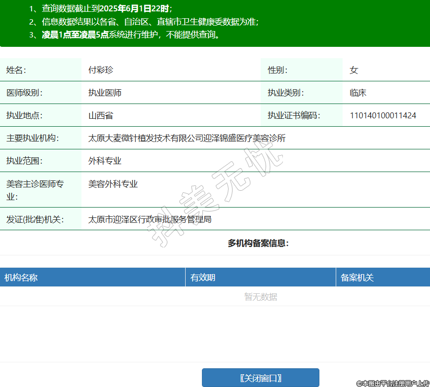 姓名:付彩珍性別:女醫(yī)師級(jí)別:執(zhí)業(yè)醫(yī)師執(zhí)業(yè)類別:臨床執(zhí)業(yè)地點(diǎn):山西省執(zhí)業(yè)證書編碼:110140100011424主要執(zhí)業(yè)機(jī)構(gòu):太原大麥微針植發(fā)技術(shù)有限公司迎澤錦盛醫(yī)療美容診所執(zhí)業(yè)范圍:外科專業(yè)美容主診醫(yī)師專業(yè):美容外科專業(yè)發(fā)證(批準(zhǔn))機(jī)關(guān):太原市迎澤區(qū)行政審批服務(wù)管理局 -