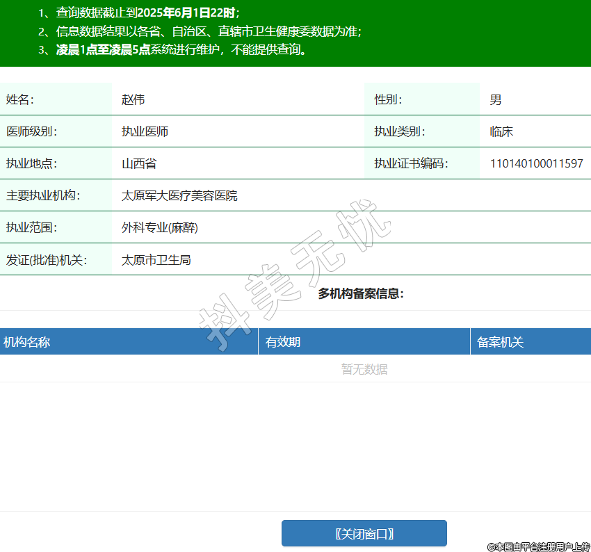 姓名:趙偉性別:男醫(yī)師級(jí)別:執(zhí)業(yè)醫(yī)師執(zhí)業(yè)類別:臨床執(zhí)業(yè)地點(diǎn):山西省執(zhí)業(yè)證書(shū)編碼:110140100011597主要執(zhí)業(yè)機(jī)構(gòu):太原軍大醫(yī)療美容醫(yī)院執(zhí)業(yè)范圍:外科專業(yè)(麻醉)發(fā)證(批準(zhǔn))機(jī)關(guān):太原市衛(wèi)生局 -