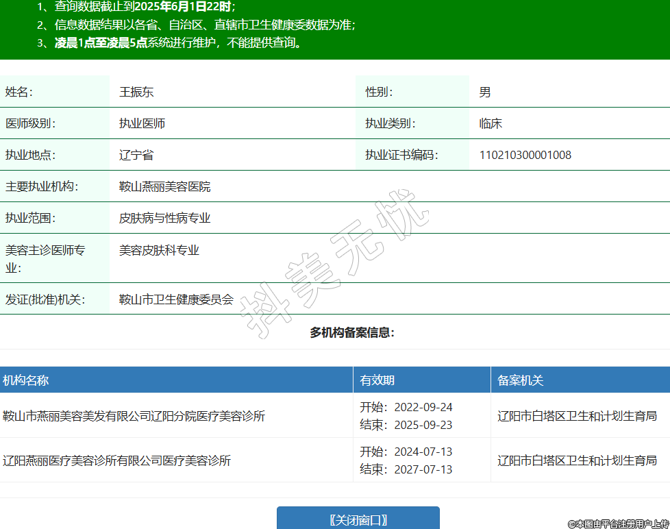 姓名:王振東性別:男醫(yī)師級別:執(zhí)業(yè)醫(yī)師執(zhí)業(yè)類別:臨床執(zhí)業(yè)地點(diǎn):遼寧省執(zhí)業(yè)證書編碼:110210300001008主要執(zhí)業(yè)機(jī)構(gòu):鞍山燕麗美容醫(yī)院執(zhí)業(yè)范圍:皮膚病與性病專業(yè)美容主診醫(yī)師專業(yè):美容皮膚科專業(yè)發(fā)證(批準(zhǔn))機(jī)關(guān):鞍山市衛(wèi)生健康委員會多機(jī)構(gòu)備案信息:機(jī)構(gòu)名稱 有效期 備案機(jī)關(guān) 鞍山市燕麗美容美發(fā)有限公司遼陽分院醫(yī)療美容診所 開始:2022-09-24結(jié)束:2025-09-23遼陽市白塔區(qū)衛(wèi)生和計(jì)劃生育局 遼陽燕麗醫(yī)療美容診所有限公司醫(yī)療美容診所 開始:2024-07-13結(jié)束:2027-07-13遼陽市白塔區(qū)衛(wèi)生和計(jì)劃生育局 -