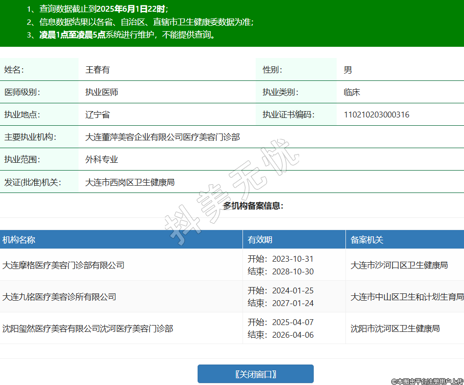 姓名:王春有性別:男醫(yī)師級別:執(zhí)業(yè)醫(yī)師執(zhí)業(yè)類別:臨床執(zhí)業(yè)地點(diǎn):遼寧省執(zhí)業(yè)證書編碼:110210203000316主要執(zhí)業(yè)機(jī)構(gòu):大連董萍美容企業(yè)有限公司醫(yī)療美容門診部執(zhí)業(yè)范圍:外科專業(yè)發(fā)證(批準(zhǔn))機(jī)關(guān):大連市西崗區(qū)衛(wèi)生健康局多機(jī)構(gòu)備案信息:機(jī)構(gòu)名稱 有效期 備案機(jī)關(guān) 大連摩格醫(yī)療美容門診部有限公司 開始:2023-10-31結(jié)束:2028-10-30大連市沙河口區(qū)衛(wèi)生健康局 大連九銘醫(yī)療美容診所有限公司 開始:2024-01-25結(jié)束:2027-01-24大連市中山區(qū)衛(wèi)生和計劃生育局 沈陽璽然醫(yī)療美容有限公司沈河醫(yī)療美容門診部 開始:2025-04-07結(jié)束:2026-04-06沈陽市沈河區(qū)衛(wèi)生健康局 -