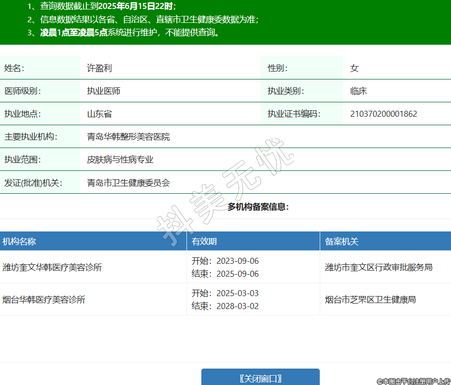 姓名:許盈利性別:女醫(yī)師級別:執(zhí)業(yè)醫(yī)師執(zhí)業(yè)類別:臨床執(zhí)業(yè)地點(diǎn):山東省執(zhí)業(yè)證書編碼:210370200001862主要執(zhí)業(yè)機(jī)構(gòu):青島華韓整形美容醫(yī)院執(zhí)業(yè)范圍:皮膚病與性病專業(yè)發(fā)證(批準(zhǔn))機(jī)關(guān):青島市衛(wèi)生健康委員會多機(jī)構(gòu)備案信息:機(jī)構(gòu)名稱 有效期 備案機(jī)關(guān) 濰坊奎文華韓醫(yī)療美容診所 開始:2023-09-06結(jié)束:2025-09-06濰坊市奎文區(qū)行政審批服務(wù)局 煙臺華韓醫(yī)療美容診所 開始:2025-03-03結(jié)束:2028-03-02煙臺市芝罘區(qū)衛(wèi)生健康局 -