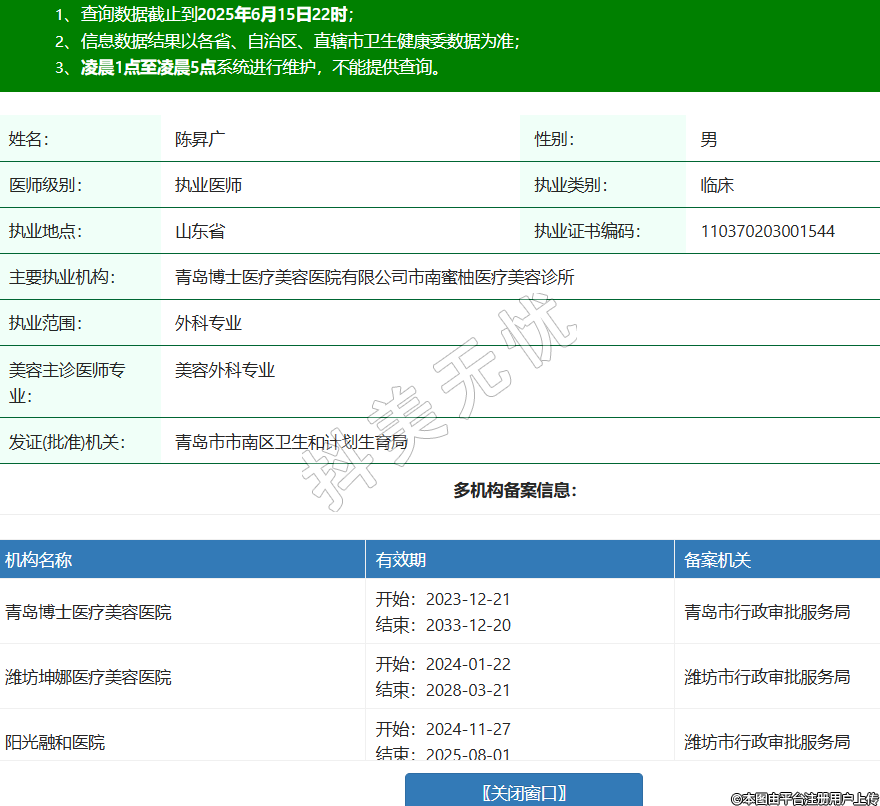姓名:陳昇廣性別:男醫(yī)師級別:執(zhí)業(yè)醫(yī)師執(zhí)業(yè)類別:臨床執(zhí)業(yè)地點(diǎn):山東省執(zhí)業(yè)證書編碼:110370203001544主要執(zhí)業(yè)機(jī)構(gòu):青島博士醫(yī)療美容醫(yī)院有限公司市南蜜柚醫(yī)療美容診所執(zhí)業(yè)范圍:外科專業(yè)美容主診醫(yī)師專業(yè):美容外科專業(yè)發(fā)證(批準(zhǔn))機(jī)關(guān):青島市市南區(qū)衛(wèi)生和計(jì)劃生育局多機(jī)構(gòu)備案信息:機(jī)構(gòu)名稱 有效期 備案機(jī)關(guān) 青島博士醫(yī)療美容醫(yī)院 開始:2023-12-21結(jié)束:2033-12-20青島市行政審批服務(wù)局 濰坊坤娜醫(yī)療美容醫(yī)院 開始:2024-01-22結(jié)束:2028-03-21濰坊市行政審批服務(wù)局 陽光融和醫(yī)院 開始:2024-11-27結(jié)束:2025-08-01濰坊市行政審批服務(wù)局 -