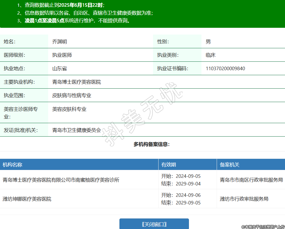 姓名:喬淵明性別:男醫(yī)師級(jí)別:執(zhí)業(yè)醫(yī)師執(zhí)業(yè)類別:臨床執(zhí)業(yè)地點(diǎn):山東省執(zhí)業(yè)證書編碼:110370200009840主要執(zhí)業(yè)機(jī)構(gòu):青島博士醫(yī)療美容醫(yī)院執(zhí)業(yè)范圍:皮膚病與性病專業(yè)美容主診醫(yī)師專業(yè):美容皮膚科專業(yè)發(fā)證(批準(zhǔn))機(jī)關(guān):青島市衛(wèi)生健康委員會(huì)多機(jī)構(gòu)備案信息:機(jī)構(gòu)名稱 有效期 備案機(jī)關(guān) 青島博士醫(yī)療美容醫(yī)院有限公司市南蜜柚醫(yī)療美容診所 開始:2024-09-05結(jié)束:2029-09-04青島市市南區(qū)行政審批服務(wù)局 濰坊坤娜醫(yī)療美容醫(yī)院 開始:2024-09-06結(jié)束:2029-09-05濰坊市行政審批服務(wù)局 -