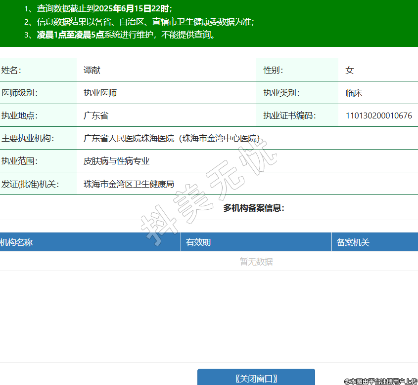 姓名:譚獻性別:女醫(yī)師級別:執(zhí)業(yè)醫(yī)師執(zhí)業(yè)類別:臨床執(zhí)業(yè)地點:廣東省執(zhí)業(yè)證書編碼:110130200010676主要執(zhí)業(yè)機構(gòu):廣東省人民醫(yī)院珠海醫(yī)院(珠海市金灣中心醫(yī)院)執(zhí)業(yè)范圍:皮膚病與性病專業(yè)發(fā)證(批準)機關(guān):珠海市金灣區(qū)衛(wèi)生健康局 -