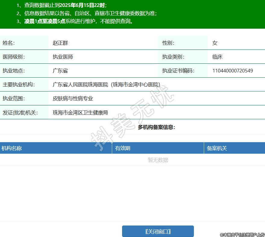 姓名:趙正群性別:女醫(yī)師級(jí)別:執(zhí)業(yè)醫(yī)師執(zhí)業(yè)類別:臨床執(zhí)業(yè)地點(diǎn):廣東省執(zhí)業(yè)證書(shū)編碼:110440000720549主要執(zhí)業(yè)機(jī)構(gòu):廣東省人民醫(yī)院珠海醫(yī)院(珠海市金灣中心醫(yī)院)執(zhí)業(yè)范圍:皮膚病與性病專業(yè)發(fā)證(批準(zhǔn))機(jī)關(guān):珠海市金灣區(qū)衛(wèi)生健康局 -