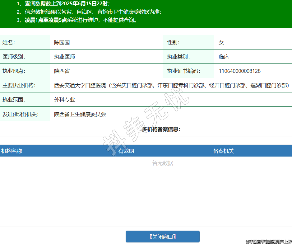 姓名:陳園園性別:女醫(yī)師級別:執(zhí)業(yè)醫(yī)師執(zhí)業(yè)類別:臨床執(zhí)業(yè)地點:陜西省執(zhí)業(yè)證書編碼:110640000008128主要執(zhí)業(yè)機構:西安交通大學口腔醫(yī)院(含興慶口腔門診部,灃東口腔專科門診部、經開口腔門診部、蓮湖口腔門診部)執(zhí)業(yè)范圍:外科專業(yè)發(fā)證(批準)機關:陜西省衛(wèi)生健康委員會 -