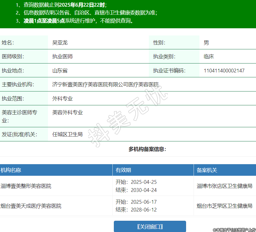 姓名:吳亞龍性別:男醫(yī)師級(jí)別:執(zhí)業(yè)醫(yī)師執(zhí)業(yè)類別:臨床執(zhí)業(yè)地點(diǎn):山東省執(zhí)業(yè)證書(shū)編碼:110411400002147主要執(zhí)業(yè)機(jī)構(gòu):濟(jì)寧新壹美醫(yī)療美容醫(yī)院有限公司醫(yī)療美容醫(yī)院執(zhí)業(yè)范圍:外科專業(yè)美容主診醫(yī)師專業(yè):美容外科專業(yè)發(fā)證(批準(zhǔn))機(jī)關(guān):任城區(qū)衛(wèi)生局多機(jī)構(gòu)備案信息:機(jī)構(gòu)名稱 有效期 備案機(jī)關(guān) 淄博壹美整形美容醫(yī)院 開(kāi)始:2025-04-25結(jié)束:2030-04-24淄博市張店區(qū)衛(wèi)生健康局 煙臺(tái)壹美天成醫(yī)療美容醫(yī)院 開(kāi)始:2025-06-17結(jié)束:2028-06-12煙臺(tái)市芝罘區(qū)衛(wèi)生健康局 -