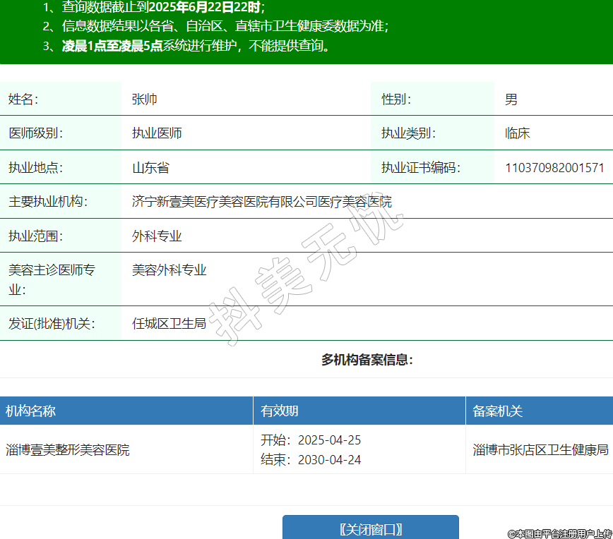 姓名:張帥性別:男醫(yī)師級別:執(zhí)業(yè)類別:臨床執(zhí)業(yè)地點:山東省執(zhí)業(yè)證書編碼:110370982001571主要執(zhí)業(yè)機構:濟寧新壹美醫(yī)療美容醫(yī)院有限公司醫(yī)療美容醫(yī)院執(zhí)業(yè)范圍:外科專業(yè)美容主診醫(yī)師專業(yè):美容外科專業(yè)發(fā)證(批準)機關:任城區(qū)衛(wèi)生局多機構備案信息:機構名稱 有效期 備案機關 淄博壹美整形美容醫(yī)院 開始:2025-04-25結束:2030-04-24淄博市張店區(qū)衛(wèi)生健康局 -