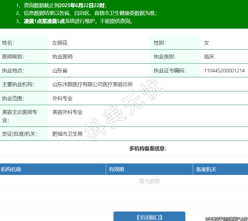 姓名:左照花性別:女醫(yī)師級(jí)別:執(zhí)業(yè)醫(yī)師執(zhí)業(yè)類別:臨床執(zhí)業(yè)地點(diǎn):山東省執(zhí)業(yè)證書編碼:110445200001214主要執(zhí)業(yè)機(jī)構(gòu):山東沐顏醫(yī)療有限公司醫(yī)療美容診所執(zhí)業(yè)范圍:外科專業(yè)美容主診醫(yī)師專業(yè):美容外科專業(yè)發(fā)證(批準(zhǔn))機(jī)關(guān):肥城市衛(wèi)生局 -