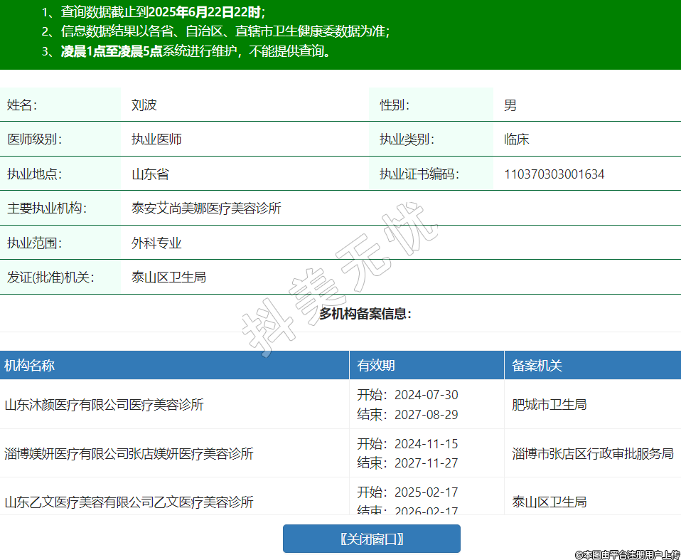 姓名:劉波性別:男醫(yī)師級(jí)別:執(zhí)業(yè)醫(yī)師執(zhí)業(yè)類別:臨床執(zhí)業(yè)地點(diǎn):山東省執(zhí)業(yè)證書編碼:110370303001634主要執(zhí)業(yè)機(jī)構(gòu):泰安艾尚美娜醫(yī)療美容診所執(zhí)業(yè)范圍:外科專業(yè)發(fā)證(批準(zhǔn))機(jī)關(guān):泰山區(qū)衛(wèi)生局多機(jī)構(gòu)備案信息:機(jī)構(gòu)名稱 有效期 備案機(jī)關(guān) 山東沐顏醫(yī)療有限公司醫(yī)療美容診所 開始:2024-07-30結(jié)束:2027-08-29肥城市衛(wèi)生局 淄博媄妍醫(yī)療有限公司張店媄妍醫(yī)療美容診所 開始:2024-11-15結(jié)束:2027-11-27淄博市張店區(qū)行政審批服務(wù)局 山東乙文醫(yī)療美容有限公司乙文醫(yī)療美容診所 開始:2025-02-17結(jié)束:2026-02-17泰山區(qū)衛(wèi)生局 -