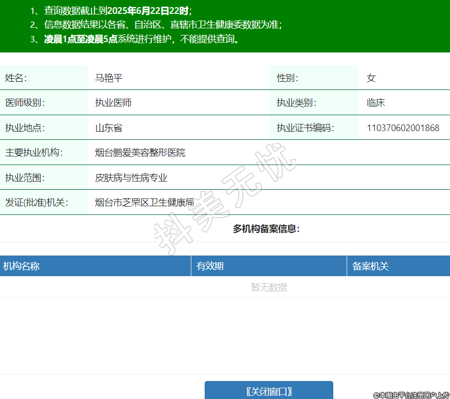 姓名:馬艷平性別:女醫(yī)師級(jí)別:執(zhí)業(yè)醫(yī)師執(zhí)業(yè)類別:臨床執(zhí)業(yè)地點(diǎn):山東省執(zhí)業(yè)證書編碼:110370602001868主要執(zhí)業(yè)機(jī)構(gòu):煙臺(tái)鵬愛美容整形醫(yī)院執(zhí)業(yè)范圍:皮膚病與性病專業(yè)發(fā)證(批準(zhǔn))機(jī)關(guān):煙臺(tái)市芝罘區(qū)衛(wèi)生健康局 -