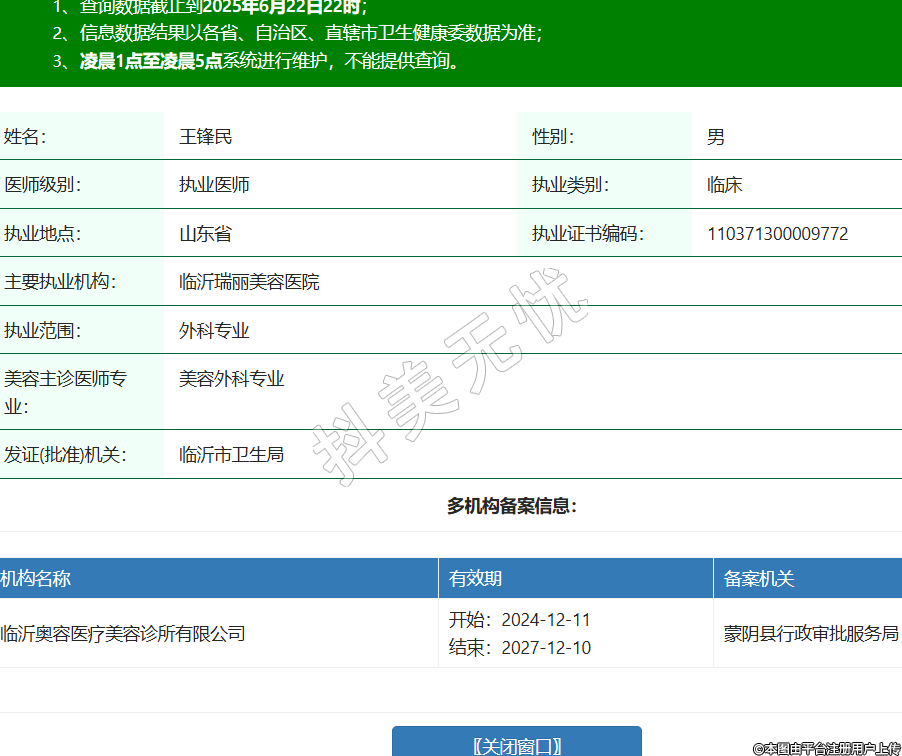 姓名:王鋒民性別:男醫(yī)師級別:執(zhí)業(yè)醫(yī)師執(zhí)業(yè)類別:臨床執(zhí)業(yè)地點:山東省執(zhí)業(yè)證書編碼:110371300009772主要執(zhí)業(yè)機構(gòu):臨沂瑞麗美容醫(yī)院執(zhí)業(yè)范圍:外科專業(yè)美容主診醫(yī)師專業(yè):美容外科專業(yè)發(fā)證(批準)機關(guān):臨沂市衛(wèi)生局多機構(gòu)備案信息:機構(gòu)名稱 有效期 備案機關(guān) 臨沂奧容醫(yī)療美容診所有限公司 開始:2024-12-11結(jié)束:2027-12-10蒙陰縣行政審批服務局 -