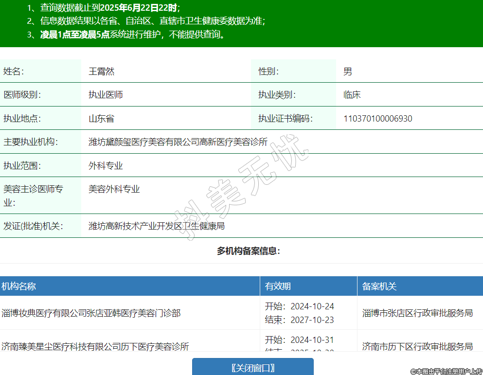姓名:王霄然性別:男醫(yī)師級別:執(zhí)業(yè)醫(yī)師執(zhí)業(yè)類別:臨床執(zhí)業(yè)地點(diǎn):山東省執(zhí)業(yè)證書編碼:110370100006930主要執(zhí)業(yè)機(jī)構(gòu):濰坊黛顏璽醫(yī)療美容有限公司高新醫(yī)療美容診所執(zhí)業(yè)范圍:外科專業(yè)美容主診醫(yī)師專業(yè):美容外科專業(yè)發(fā)證(批準(zhǔn))機(jī)關(guān):濰坊高新技術(shù)產(chǎn)業(yè)開發(fā)區(qū)衛(wèi)生健康局多機(jī)構(gòu)備案信息:機(jī)構(gòu)名稱 有效期 備案機(jī)關(guān) 淄博妝典醫(yī)療有限公司張店亞韓醫(yī)療美容門診部 開始:2024-10-24結(jié)束:2027-10-23淄博市張店區(qū)行政審批服務(wù)局 濟(jì)南臻美星塵醫(yī)療科技有限公司歷下醫(yī)療美容診所 開始:2024-10-31結(jié)束:2025-10-30濟(jì)南市歷下區(qū)行政審批服務(wù)局 天橋天逸美醫(yī)療美容門診部 開始:2025-01-22結(jié)束:2026-01-21天橋區(qū)衛(wèi)生局 天橋麗美醫(yī)療美容診所 開始:2025-03-13結(jié)束:2027-03-12天橋區(qū)衛(wèi)生局 淄博東顏醫(yī)療美容有限公司張店東顏醫(yī)療美容門診部 開始:2025-03-23結(jié)束:2026-03-20淄博市張店區(qū)衛(wèi)生健康局 濟(jì)南市機(jī)關(guān)醫(yī)院 開始:2025-05-07結(jié)束:2026-05-06濟(jì)南市中醫(yī)管理局 濟(jì)南市萊蕪區(qū)鵬泉街道社區(qū)衛(wèi)生服務(wù)中心 開始:2025-05-10結(jié)束:2026-05-08濟(jì)南市萊蕪區(qū)衛(wèi)生健康局 大洋醫(yī)療美容診所(濟(jì)南)有限公司歷下醫(yī)療美容診所 開始:2025-05-21結(jié)束:2026-05-20濟(jì)南市歷下區(qū)行政審批服務(wù)局 濟(jì)南成仁智美醫(yī)療美容有限公司歷下醫(yī)療美容診所 開始:2025-06-03結(jié)束:2026-06-02濟(jì)南市歷下區(qū)衛(wèi)生健康局 濟(jì)南伊百美醫(yī)院管理有限公司槐蔭奧若拉醫(yī)療美容診所 開始:2025-06-11結(jié)束:2026-06-10濟(jì)南市槐蔭區(qū)行政審批服務(wù)局 -
