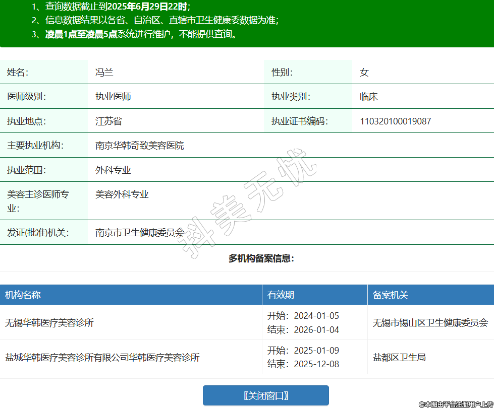 姓名:馮蘭性別:女醫(yī)師級別:執(zhí)業(yè)醫(yī)師執(zhí)業(yè)類別:臨床執(zhí)業(yè)地點(diǎn):江蘇省執(zhí)業(yè)證書編碼:110320100019087主要執(zhí)業(yè)機(jī)構(gòu):南京華韓奇致美容醫(yī)院執(zhí)業(yè)范圍:外科專業(yè)美容主診醫(yī)師專業(yè):美容外科專業(yè)發(fā)證(批準(zhǔn))機(jī)關(guān):南京市衛(wèi)生健康委員會多機(jī)構(gòu)備案信息:機(jī)構(gòu)名稱 有效期 備案機(jī)關(guān) 無錫華韓醫(yī)療美容診所 開始:2024-01-05結(jié)束:2026-01-04無錫市錫山區(qū)衛(wèi)生健康委員會 鹽城華韓醫(yī)療美容診所有限公司華韓醫(yī)療美容診所 開始:2025-01-09結(jié)束:2025-12-08鹽都區(qū)衛(wèi)生局 -