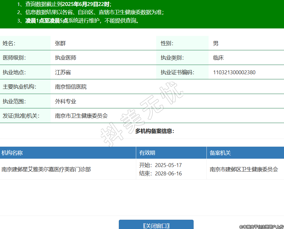 姓名:張群性別:男醫(yī)師級(jí)別:執(zhí)業(yè)醫(yī)師執(zhí)業(yè)類別:臨床執(zhí)業(yè)地點(diǎn):江蘇省執(zhí)業(yè)證書編碼:110321300002380主要執(zhí)業(yè)機(jī)構(gòu):南京恒信醫(yī)院執(zhí)業(yè)范圍:外科專業(yè)發(fā)證(批準(zhǔn))機(jī)關(guān):南京市衛(wèi)生健康委員會(huì)多機(jī)構(gòu)備案信息:機(jī)構(gòu)名稱 有效期 備案機(jī)關(guān) 南京建鄴星艾雅美爾嘉醫(yī)療美容門診部 開始:2025-05-17結(jié)束:2028-06-16南京市建鄴區(qū)衛(wèi)生健康委員會(huì) -