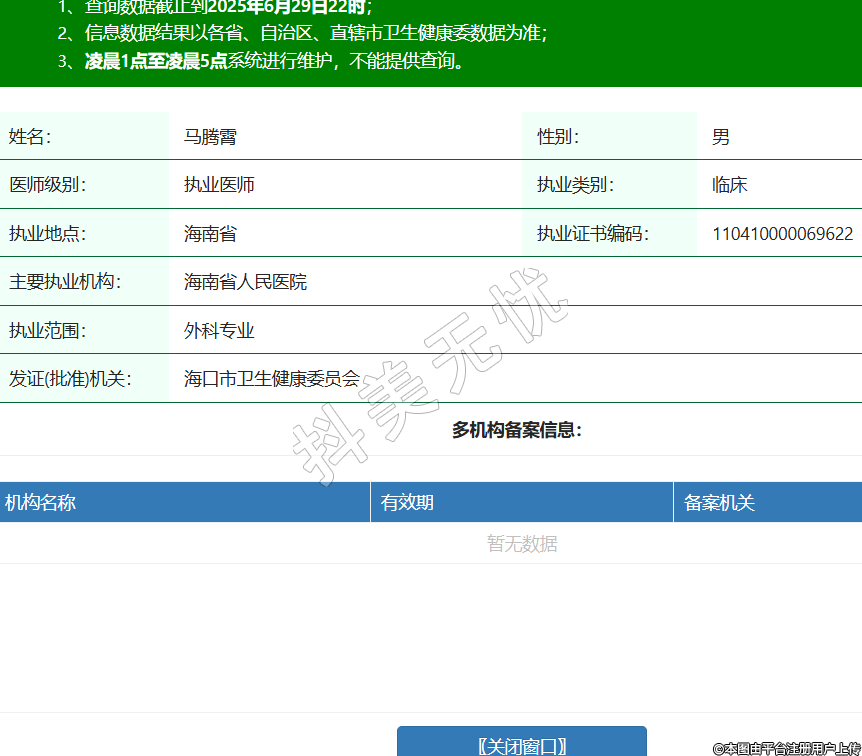 姓名:馬騰霄性別:男醫(yī)師級別:執(zhí)業(yè)醫(yī)師執(zhí)業(yè)類別:臨床執(zhí)業(yè)地點(diǎn):海南省執(zhí)業(yè)證書編碼:110410000069622主要執(zhí)業(yè)機(jī)構(gòu):海南省人民醫(yī)院執(zhí)業(yè)范圍:外科專業(yè)發(fā)證(批準(zhǔn))機(jī)關(guān):海口市衛(wèi)生健康委員會 -