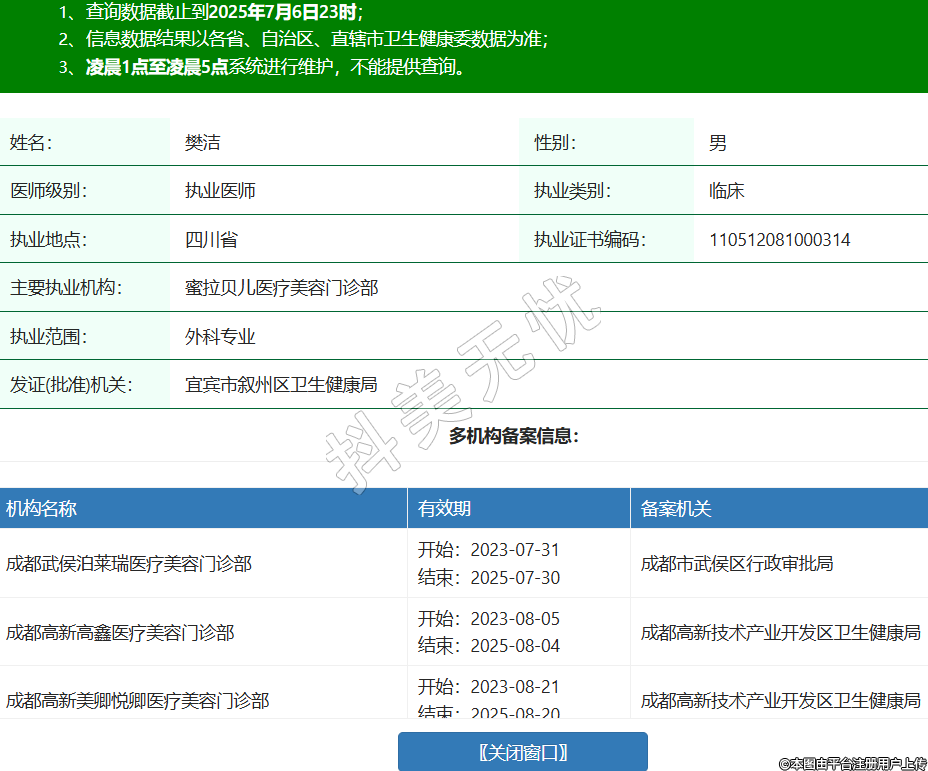 姓名:樊潔性別:男醫(yī)師級別:執(zhí)業(yè)醫(yī)師執(zhí)業(yè)類別:臨床執(zhí)業(yè)地點:四川省執(zhí)業(yè)證書編碼:110512081000314主要執(zhí)業(yè)機構(gòu):蜜拉貝兒醫(yī)療美容門診部執(zhí)業(yè)范圍:外科專業(yè)發(fā)證(批準(zhǔn))機關(guān):宜賓市敘州區(qū)衛(wèi)生健康局多機構(gòu)備案信息:機構(gòu)名稱 有效期 備案機關(guān) 成都武侯泊萊瑞醫(yī)療美容門診部 開始:2023-07-31結(jié)束:2025-07-30成都市武侯區(qū)行政審批局 成都高新高鑫醫(yī)療美容門診部 開始:2023-08-05結(jié)束:2025-08-04成都高新技術(shù)產(chǎn)業(yè)開發(fā)區(qū)衛(wèi)生健康局 成都高新美卿悅卿醫(yī)療美容門診部 開始:2023-08-21結(jié)束:2025-08-20成都高新技術(shù)產(chǎn)業(yè)開發(fā)區(qū)衛(wèi)生健康局 成都武侯卓媛伊鎂醫(yī)療美容診所 開始:2023-09-29結(jié)束:2025-09-28成都市武侯區(qū)行政審批局 成都武侯柏蕊醫(yī)療美容門診部 開始:2024-01-04結(jié)束:2026-01-03成都市武侯區(qū)行政審批局 成都錦江昱蓉薈醫(yī)療美容門診部 開始:2024-01-30結(jié)束:2026-01-31成都市錦江區(qū)行政審批局 成都成華俏百顏萊優(yōu)醫(yī)療美容門診部 開始:2024-04-01結(jié)束:2026-03-31成都市成華區(qū)行政審批局 江陽蜜拉心顏醫(yī)療美容門診部 開始:2024-05-06結(jié)束:2027-06-05瀘州市江陽區(qū)衛(wèi)生健康局 西昌俏百顏醫(yī)療美容診所 開始:2024-07-20結(jié)束:2026-07-20西昌市衛(wèi)生健康局 成都武侯蝶莎醫(yī)療美容門診部 開始:2025-02-17結(jié)束:2027-02-16成都市武侯區(qū)行政審批局 -