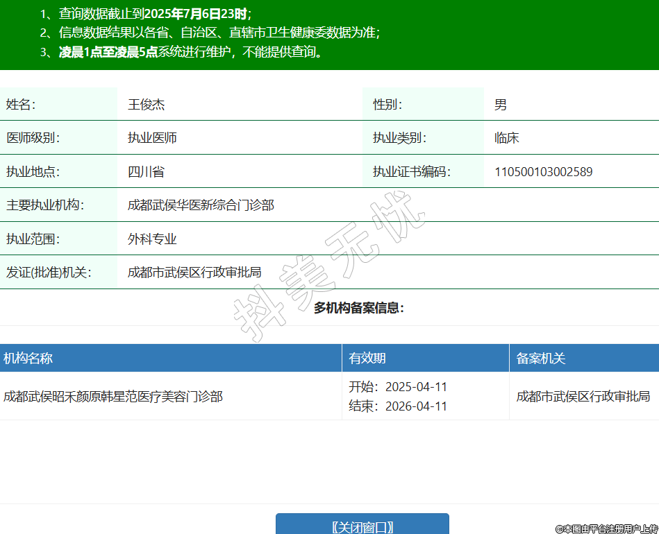 姓名:王俊杰性別:男醫(yī)師級(jí)別:執(zhí)業(yè)醫(yī)師執(zhí)業(yè)類別:臨床執(zhí)業(yè)地點(diǎn):四川省執(zhí)業(yè)證書編碼:110500103002589主要執(zhí)業(yè)機(jī)構(gòu):成都武侯華醫(yī)新綜合門診部執(zhí)業(yè)范圍:外科專業(yè)發(fā)證(批準(zhǔn))機(jī)關(guān):成都市武侯區(qū)行政審批局多機(jī)構(gòu)備案信息:機(jī)構(gòu)名稱 有效期 備案機(jī)關(guān) 成都武侯昭禾顏原韓星范醫(yī)療美容門診部 開(kāi)始:2025-04-11結(jié)束:2026-04-11成都市武侯區(qū)行政審批局 -