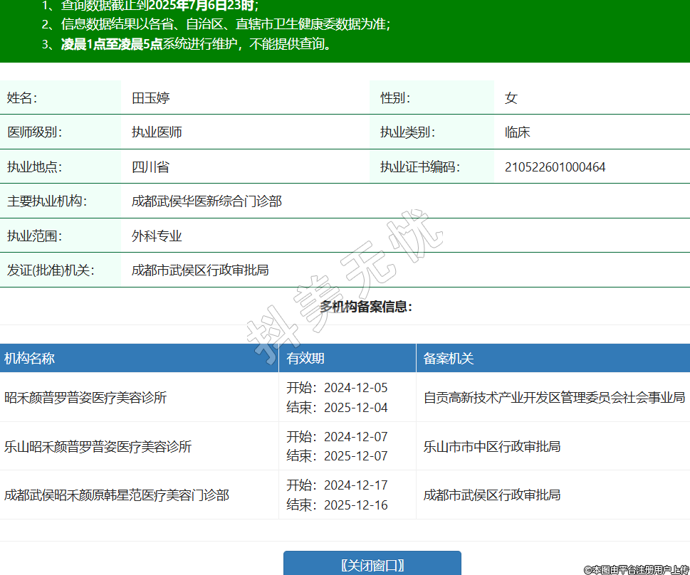 姓名:田玉婷性別:女醫(yī)師級(jí)別:執(zhí)業(yè)醫(yī)師執(zhí)業(yè)類(lèi)別:臨床執(zhí)業(yè)地點(diǎn):四川省執(zhí)業(yè)證書(shū)編碼:210522601000464主要執(zhí)業(yè)機(jī)構(gòu):成都武侯華醫(yī)新綜合門(mén)診部執(zhí)業(yè)范圍:外科專(zhuān)業(yè)發(fā)證(批準(zhǔn))機(jī)關(guān):成都市武侯區(qū)行政審批局多機(jī)構(gòu)備案信息:機(jī)構(gòu)名稱(chēng) 有效期 備案機(jī)關(guān) 昭禾顏普羅普姿醫(yī)療美容診所 開(kāi)始:2024-12-05結(jié)束:2025-12-04自貢高新技術(shù)產(chǎn)業(yè)開(kāi)發(fā)區(qū)管理委員會(huì)社會(huì)事業(yè)局 樂(lè)山昭禾顏普羅普姿醫(yī)療美容診所 開(kāi)始:2024-12-07結(jié)束:2025-12-07樂(lè)山市市中區(qū)行政審批局 成都武侯昭禾顏原韓星范醫(yī)療美容門(mén)診部 開(kāi)始:2024-12-17結(jié)束:2025-12-16成都市武侯區(qū)行政審批局 -