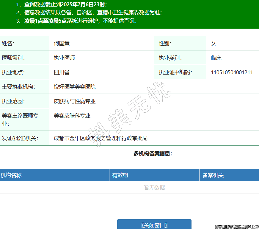 姓名:何國(guó)慧性別:女醫(yī)師級(jí)別:執(zhí)業(yè)醫(yī)師執(zhí)業(yè)類別:臨床執(zhí)業(yè)地點(diǎn):四川省執(zhí)業(yè)證書編碼:110510504001211主要執(zhí)業(yè)機(jī)構(gòu):悅好醫(yī)學(xué)美容醫(yī)院執(zhí)業(yè)范圍:皮膚病與性病專業(yè)美容主診醫(yī)師專業(yè):美容皮膚科專業(yè)發(fā)證(批準(zhǔn))機(jī)關(guān):成都市金牛區(qū)政務(wù)服務(wù)管理和行政審批局 -