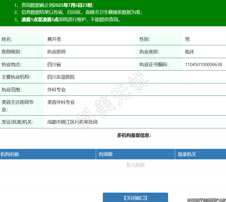 姓名:黃開亮性別:男醫(yī)師級別:執(zhí)業(yè)醫(yī)師執(zhí)業(yè)類別:臨床執(zhí)業(yè)地點(diǎn):四川省執(zhí)業(yè)證書編碼:110450100006638主要執(zhí)業(yè)機(jī)構(gòu):四川友誼醫(yī)院執(zhí)業(yè)范圍:外科專業(yè)美容主診醫(yī)師專業(yè):美容外科專業(yè)發(fā)證(批準(zhǔn))機(jī)關(guān):成都市錦江區(qū)行政審批局 -
