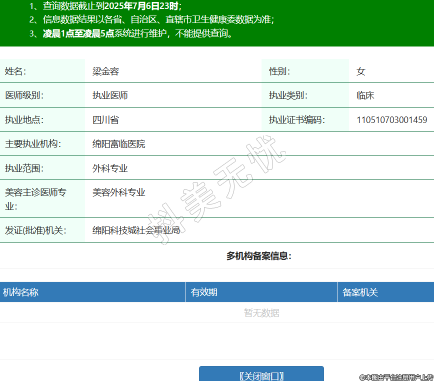 姓名:梁金容性別:女醫(yī)師級(jí)別:執(zhí)業(yè)醫(yī)師執(zhí)業(yè)類別:臨床執(zhí)業(yè)地點(diǎn):四川省執(zhí)業(yè)證書(shū)編碼:110510703001459主要執(zhí)業(yè)機(jī)構(gòu):綿陽(yáng)富臨醫(yī)院執(zhí)業(yè)范圍:外科專業(yè)美容主診醫(yī)師專業(yè):美容外科專業(yè)發(fā)證(批準(zhǔn))機(jī)關(guān):綿陽(yáng)科技城社會(huì)事業(yè)局 -