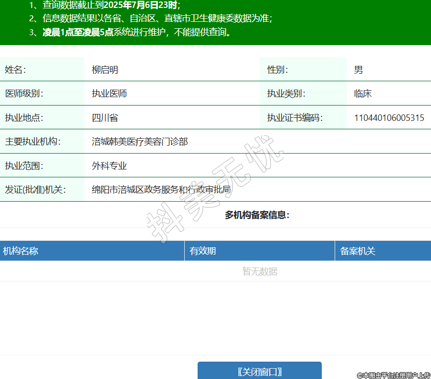 姓名:柳啟明性別:男醫(yī)師級別:執(zhí)業(yè)醫(yī)師執(zhí)業(yè)類別:臨床執(zhí)業(yè)地點(diǎn):四川省執(zhí)業(yè)證書編碼:110440106005315主要執(zhí)業(yè)機(jī)構(gòu):涪城韓美醫(yī)療美容門診部執(zhí)業(yè)范圍:外科專業(yè)發(fā)證(批準(zhǔn))機(jī)關(guān):綿陽市涪城區(qū)政務(wù)服務(wù)和行政審批局 -