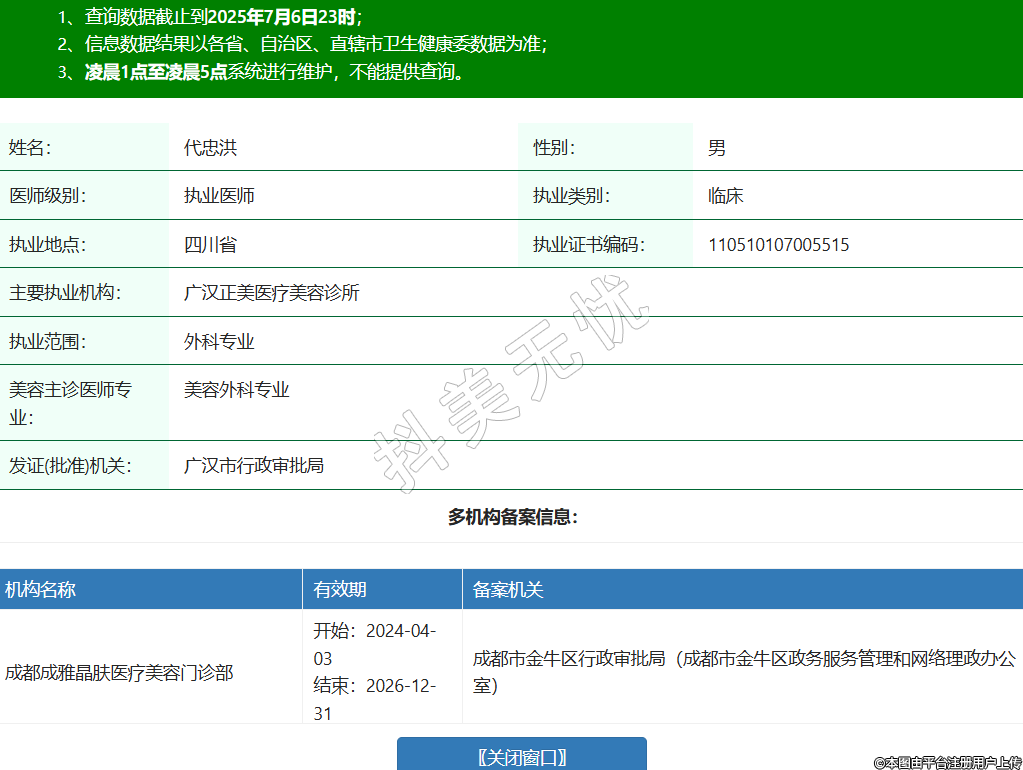 姓名:代忠洪性別:男醫(yī)師級別:執(zhí)業(yè)醫(yī)師執(zhí)業(yè)類別:臨床執(zhí)業(yè)地點(diǎn):四川省執(zhí)業(yè)證書編碼:110510107005515主要執(zhí)業(yè)機(jī)構(gòu):廣漢正美醫(yī)療美容診所執(zhí)業(yè)范圍:外科專業(yè)美容主診醫(yī)師專業(yè):美容外科專業(yè)發(fā)證(批準(zhǔn))機(jī)關(guān):廣漢市行政審批局多機(jī)構(gòu)備案信息:機(jī)構(gòu)名稱 有效期 備案機(jī)關(guān) 成都成雅晶膚醫(yī)療美容門診部 開始:2024-04-03結(jié)束:2026-12-31成都市金牛區(qū)行政審批局(成都市金牛區(qū)政務(wù)服務(wù)管理和網(wǎng)絡(luò)理政辦公室) 成都高新中美瑞辰綜合門診部 開始:2024-04-04結(jié)束:2026-12-31成都高新技術(shù)產(chǎn)業(yè)開發(fā)區(qū)衛(wèi)生健康局 成都青羊侑姿醫(yī)療美容門診部 開始:2024-04-09結(jié)束:2026-12-08成都市青羊區(qū)行政審批局(成都市青羊區(qū)政務(wù)服務(wù)管理和網(wǎng)絡(luò)理政辦公室) 華人醫(yī)聯(lián)整形美容醫(yī)院 開始:2024-04-15結(jié)束:2026-12-31成都市青羊區(qū)行政審批局(成都市青羊區(qū)政務(wù)服務(wù)管理和網(wǎng)絡(luò)理政辦公室) 成都高新熙之環(huán)亞醫(yī)療美容醫(yī)院 開始:2024-04-24結(jié)束:2026-12-31成都高新技術(shù)產(chǎn)業(yè)開發(fā)區(qū)衛(wèi)生健康局 成都武侯華生鉑悅美容醫(yī)院 開始:2024-05-15結(jié)束:2028-12-31成都市武侯區(qū)行政審批局 成都青羊華人醫(yī)聯(lián)為美醫(yī)療美容門診部 開始:2024-07-06結(jié)束:2027-12-31成都市青羊區(qū)行政審批局(成都市青羊區(qū)政務(wù)服務(wù)管理和網(wǎng)絡(luò)理政辦公室) 成都武侯圣形醫(yī)療美容門診部 開始:2024-08-21結(jié)束:2026-12-31成都市武侯區(qū)行政審批局 成都高新科賦麗爾醫(yī)療美容診所 開始:2024-10-22結(jié)束:2026-10-31成都高新技術(shù)產(chǎn)業(yè)開發(fā)區(qū)衛(wèi)生健康局 -
