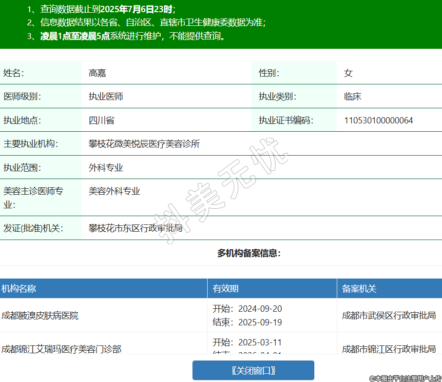 姓名:高嘉性別:女醫(yī)師級別:執(zhí)業(yè)醫(yī)師執(zhí)業(yè)類別:臨床執(zhí)業(yè)地點:四川省執(zhí)業(yè)證書編碼:110530100000064主要執(zhí)業(yè)機構(gòu):攀枝花微美悅辰醫(yī)療美容診所執(zhí)業(yè)范圍:外科專業(yè)美容主診醫(yī)師專業(yè):美容外科專業(yè)發(fā)證(批準(zhǔn))機關(guān):攀枝花市東區(qū)行政審批局多機構(gòu)備案信息:機構(gòu)名稱 有效期 備案機關(guān) 成都腋溴皮膚病醫(yī)院 開始:2024-09-20結(jié)束:2025-09-19成都市武侯區(qū)行政審批局 成都錦江艾瑞瑪醫(yī)療美容門診部 開始:2025-03-11結(jié)束:2026-04-01成都市錦江區(qū)行政審批局 成都成華圣華悅妍醫(yī)療美容診所 開始:2025-06-10結(jié)束:2026-06-09成都市成華區(qū)行政審批局 -