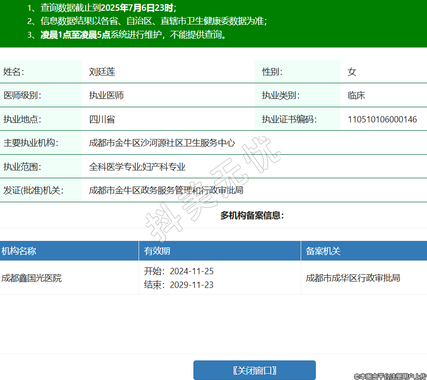 姓名:劉廷蓮性別:女醫(yī)師級(jí)別:執(zhí)業(yè)醫(yī)師執(zhí)業(yè)類(lèi)別:臨床執(zhí)業(yè)地點(diǎn):四川省執(zhí)業(yè)證書(shū)編碼:110510106000146主要執(zhí)業(yè)機(jī)構(gòu):成都市金牛區(qū)沙河源社區(qū)衛(wèi)生服務(wù)中心執(zhí)業(yè)范圍:全科醫(yī)學(xué)專(zhuān)業(yè);婦產(chǎn)科專(zhuān)業(yè)發(fā)證(批準(zhǔn))機(jī)關(guān):成都市金牛區(qū)政務(wù)服務(wù)管理和行政審批局多機(jī)構(gòu)備案信息:機(jī)構(gòu)名稱(chēng) 有效期 備案機(jī)關(guān) 成都鑫國(guó)光醫(yī)院 開(kāi)始:2024-11-25結(jié)束:2029-11-23成都市成華區(qū)行政審批局 -