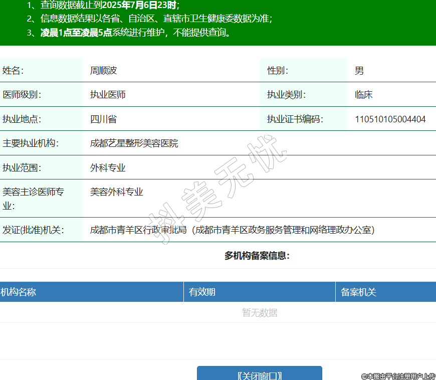 姓名:周順波性別:男醫(yī)師級別:執(zhí)業(yè)醫(yī)師執(zhí)業(yè)類別:臨床執(zhí)業(yè)地點:四川省執(zhí)業(yè)證書編碼:110510105004404主要執(zhí)業(yè)機構(gòu):成都藝星整形美容醫(yī)院執(zhí)業(yè)范圍:外科專業(yè)美容主診醫(yī)師專業(yè):美容外科專業(yè)發(fā)證(批準)機關(guān):成都市青羊區(qū)行政審批局(成都市青羊區(qū)政務服務管理和網(wǎng)絡理政辦公室) -