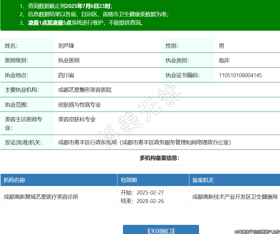 姓名:劉蘆鋒性別:男醫(yī)師級(jí)別:執(zhí)業(yè)醫(yī)師執(zhí)業(yè)類別:臨床執(zhí)業(yè)地點(diǎn):四川省執(zhí)業(yè)證書編碼:110510108004145主要執(zhí)業(yè)機(jī)構(gòu):成都藝星整形美容醫(yī)院執(zhí)業(yè)范圍:皮膚病與性病專業(yè)美容主診醫(yī)師專業(yè):美容皮膚科專業(yè)發(fā)證(批準(zhǔn))機(jī)關(guān):成都市青羊區(qū)行政審批局(成都市青羊區(qū)政務(wù)服務(wù)管理和網(wǎng)絡(luò)理政辦公室)多機(jī)構(gòu)備案信息:機(jī)構(gòu)名稱 有效期 備案機(jī)關(guān) 成都高新復(fù)城藝星醫(yī)療美容診所 開始:2025-02-27結(jié)束:2028-02-26成都高新技術(shù)產(chǎn)業(yè)開發(fā)區(qū)衛(wèi)生健康局 -
