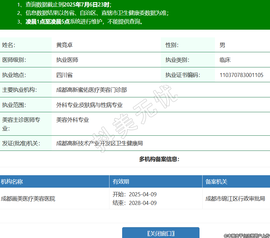 姓名:黃競卓性別:男醫(yī)師級別:執(zhí)業(yè)醫(yī)師執(zhí)業(yè)類別:臨床執(zhí)業(yè)地點:四川省執(zhí)業(yè)證書編碼:110370783001105主要執(zhí)業(yè)機(jī)構(gòu):成都高新蜜佑醫(yī)療美容門診部執(zhí)業(yè)范圍:外科專業(yè);皮膚病與性病專業(yè)美容主診醫(yī)師專業(yè):美容外科專業(yè)發(fā)證(批準(zhǔn))機(jī)關(guān):成都高新技術(shù)產(chǎn)業(yè)開發(fā)區(qū)衛(wèi)生健康局多機(jī)構(gòu)備案信息:機(jī)構(gòu)名稱 有效期 備案機(jī)關(guān) 成都畫美醫(yī)療美容醫(yī)院 開始:2025-04-09結(jié)束:2028-04-09成都市錦江區(qū)行政審批局 -