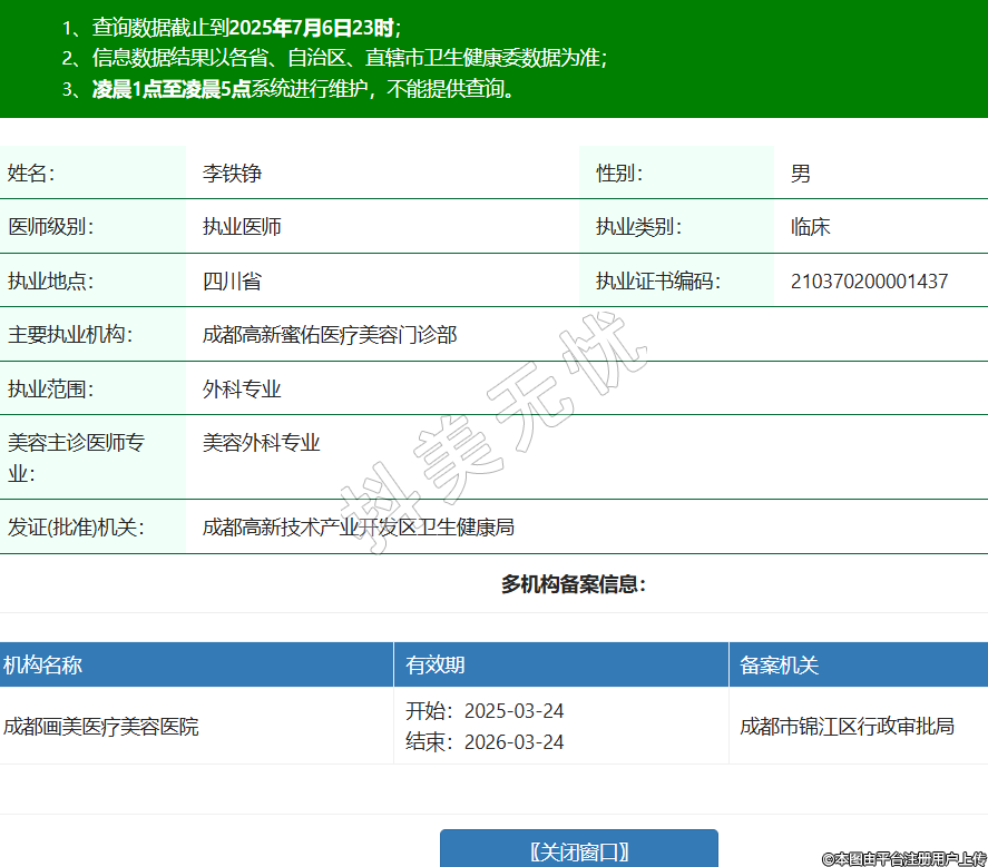 姓名:李鐵錚性別:男醫(yī)師級別:執(zhí)業(yè)醫(yī)師執(zhí)業(yè)類別:臨床執(zhí)業(yè)地點:四川省執(zhí)業(yè)證書編碼:210370200001437主要執(zhí)業(yè)機構(gòu):成都高新蜜佑醫(yī)療美容門診部執(zhí)業(yè)范圍:外科專業(yè)美容主診醫(yī)師專業(yè):美容外科專業(yè)發(fā)證(批準(zhǔn))機關(guān):成都高新技術(shù)產(chǎn)業(yè)開發(fā)區(qū)衛(wèi)生健康局多機構(gòu)備案信息:機構(gòu)名稱 有效期 備案機關(guān) 成都畫美醫(yī)療美容醫(yī)院 開始:2025-03-24結(jié)束:2026-03-24成都市錦江區(qū)行政審批局 -