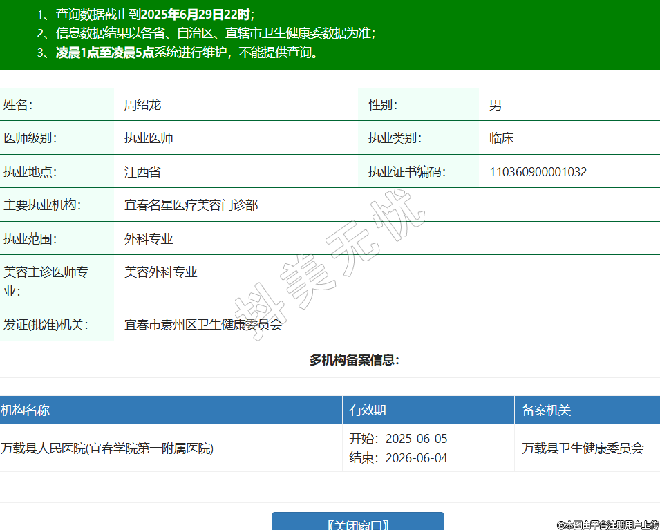 姓名:周紹龍性別:男醫(yī)師級(jí)別:執(zhí)業(yè)醫(yī)師執(zhí)業(yè)類別:臨床執(zhí)業(yè)地點(diǎn):江西省執(zhí)業(yè)證書編碼:110360900001032主要執(zhí)業(yè)機(jī)構(gòu):宜春名星醫(yī)療美容門診部執(zhí)業(yè)范圍:外科專業(yè)美容主診醫(yī)師專業(yè):美容外科專業(yè)發(fā)證(批準(zhǔn))機(jī)關(guān):宜春市袁州區(qū)衛(wèi)生健康委員會(huì)多機(jī)構(gòu)備案信息:機(jī)構(gòu)名稱 有效期 備案機(jī)關(guān) 萬載縣人民醫(yī)院(宜春學(xué)院第一附屬醫(yī)院) 開始:2025-06-05結(jié)束:2026-06-04萬載縣衛(wèi)生健康委員會(huì) -
