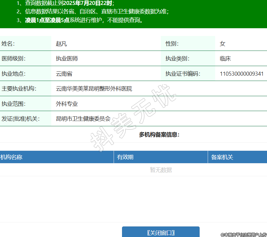 姓名:趙凡性別:女醫(yī)師級別:執(zhí)業(yè)醫(yī)師執(zhí)業(yè)類別:臨床執(zhí)業(yè)地點(diǎn):云南省執(zhí)業(yè)證書編碼:110530000009341主要執(zhí)業(yè)機(jī)構(gòu):云南華美美萊昆明整形外科醫(yī)院執(zhí)業(yè)范圍:外科專業(yè)發(fā)證(批準(zhǔn))機(jī)關(guān):昆明市衛(wèi)生健康委員會 -