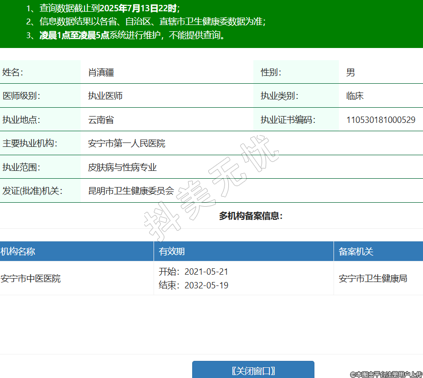 姓名:肖滇疆性別:男醫(yī)師級別:執(zhí)業(yè)醫(yī)師執(zhí)業(yè)類別:臨床執(zhí)業(yè)地點:云南省執(zhí)業(yè)證書編碼:110530181000529主要執(zhí)業(yè)機構(gòu):安寧市第一人民醫(yī)院執(zhí)業(yè)范圍:皮膚病與性病專業(yè)發(fā)證(批準)機關:昆明市衛(wèi)生健康委員會多機構(gòu)備案信息:機構(gòu)名稱 有效期 備案機關 安寧市中醫(yī)醫(yī)院 開始:2021-05-21結(jié)束:2032-05-19安寧市衛(wèi)生健康局 -